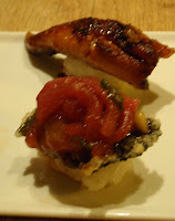 A cold night was warmed up this time with a special Miso Soup with spice and potatoes and also with traditional miso. Plates included tempura, duck with balsamic and pear, which was divine, and chef' Gari's selection of Eel and Tuna sushi.