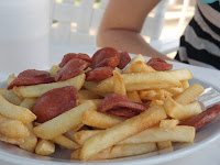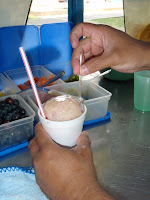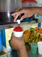 Nada mejor para un día de sol que un raspao o cholado de hielo con Kola, y fruta por dentro luego cubierto le leche condensada. Yo prefiero banano o guineo y otros el ácido lulo. Para Dani salchipapas...frito y ma frito